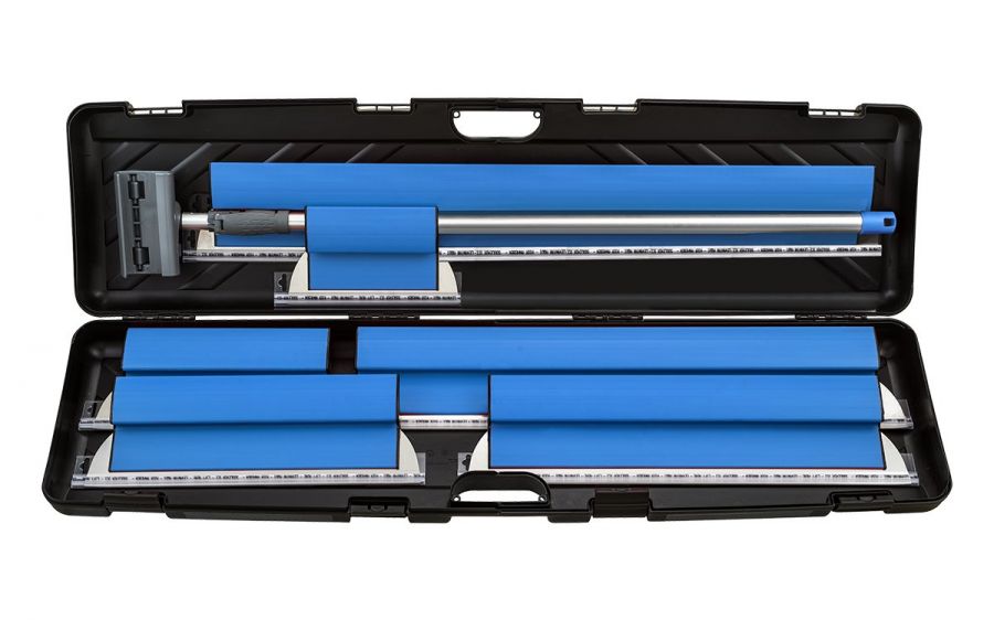 Zestaw narzędzi do szpachlowania powierzchni ścian i sufitów umożliwiający rozprowadzenie masy bardzo cienką warstwą nadając jej idealną gładkość. Zestaw zawiera: noże o szerokości 25 cm, 35 cm, 45 cm, 60 cm, 80 cm i 100 cm oraz teleskop 2 x 1 metr. Zapakowany w walizce chroniącej narzędzia przed uszkodzeniem.