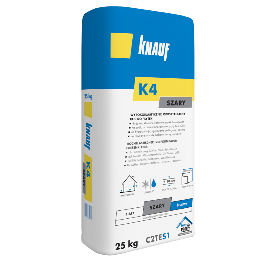 Knauf K4 w kolorze szarym sprawdzi się do klejenia chłonnych i niechłonnych okładzin ceramicznych, itp. Do klejenia płytek od małego do wielkiego formatu wewnątrz i na zewnątrz budynków. Również na wszystkie standardowe podłoża budowlane. Produkt może być stosowany m.in. w budownictwie mieszkaniowym czy też przemysłowym, garażach, obiektach usługowo-handlowych, użyteczności publicznej, biurach, nieruchomościach służby zdrowia, żłobkach, przedszkolach, szkołach i innych.