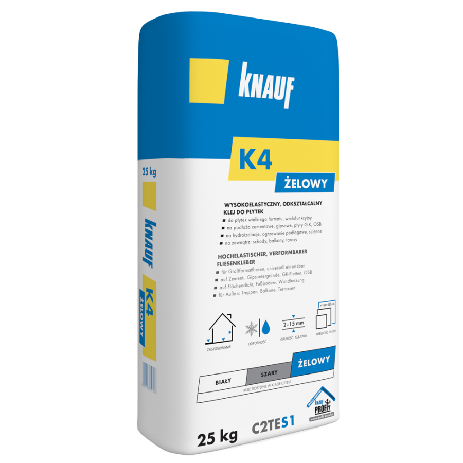 Knauf K4 żelowy to nowoczesny klej do płytek, który został opracowany z wykorzystaniem innowacyjnej technologii żelowej. Formuła zawierająca aktywny krzemian żelujący zapewnia wyjątkową przyczepność i łatwość nakładania, a sam produkt charakteryzuje się zwiększoną elastycznością. Możesz go stosować na trudnych, odkształcalnych podłożach, takich jak płyty OSB, stare płytki, podłoża z ogrzewaniem podłogowym czy powierzchnie z hydroizolacją. Dzięki klasie S1 możliwe jest kompensowanie niewielkich ruchów i drgań podłoża bez ryzyka odspajania płytek.