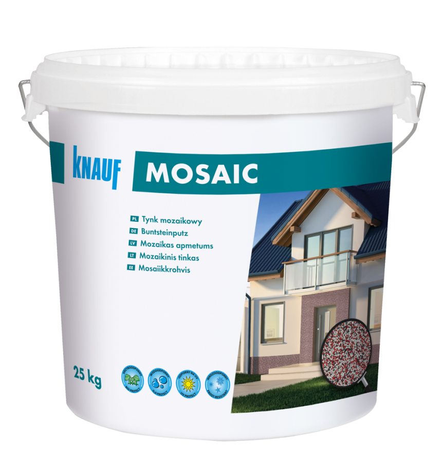 Tynk mozaikowy to specjalnie dobrana żywica silikonowo-akrylowa w połączeniu z wysokiej jakości kolorowym kruszywem. Knauf Mosaic jest wysoce odporny na wodę i mróz. Idealnie nadający się na wykończenia cokołów, klatek schodowych, ciągów komunikacyjnych itp. Do wnętrz i na zewnątrz.